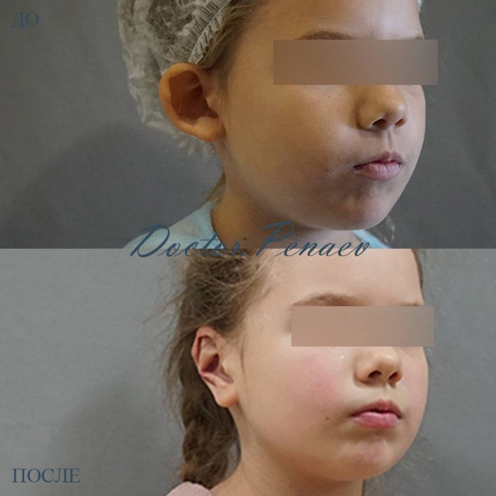Пациентка доктора А.А. Пенаева, 6 лет. Лопоухость обеих ушных раковин. Выполнена отопластика с лазерной коррекцией ушного хряща по оригинальной методике. Результат через три месяца после операции