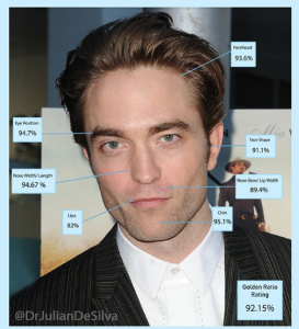 Британский актер Роберт Паттинсон, звезда фильмов «Сумерки» и «Маяк» является самым красивым мужчиной. К такому заключению пришел пластический хирург из Лондона Джулиан де Силва. Для этого доктор использовал программу, основанную на принципе золотого сечения. Пропорции лица 33-летнего артиста оказались близки к идеалу на 92,15%, поэтому врач официально назвал лицо Паттинсона самым красивым.