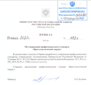 Профессия «Врач-пластический хирург» впервые внесена в реестр профессиональных стандартов РФ. Министерство юстиции Российской Федерации зарегистрировало соответствующий Приказ Министерства труда и социальной защиты Российской Федерации N482н от 31.07.2020.