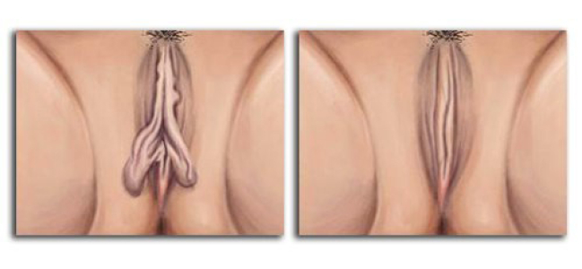 Сделать более аккуратными чрезмерно выдающиеся половые органы можно посредством липосакции или хирургической резекции (обрезания). Это актуально для женщин, у которых после родов, особенно если они не первые или поздние, происходит выпадение малых половых губ. Патологией данное явление не считается и здоровью не вредит, однако иногда становится причиной разлада в отношениях. После резекции накладываются скрытые швы. Причина не только в отсутствии необходимости их снимать, но и в том, что рубец уходит вглубь. В противном случае он будет помехой для обоих партнеров.
