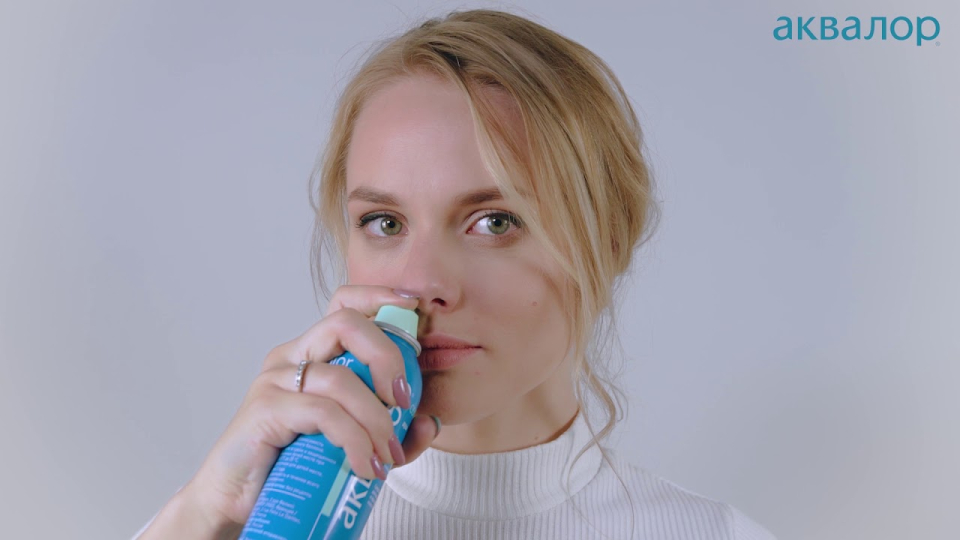 Теперь рассмотрим сам процесс промывания носа. Чтобы сделать это правильно, нужно сначала разобраться с направлением тока воздуха. Воздух, когда мы дышим, идет не вдоль спинки носа, как многие думают — мы же не в голову дышим. Воздух направляется сначала в горло, затем в легкие. Поэтому направление нижнего носового хода практически горизонтальное, то есть параллельно полу. Берем флакон «Аквалора» или «Физиомера», смотрим на носик и направляем его вдоль нижнего носового хода. Носик глубоко вставлять не нужно, всего на треть и нажимаем на колпачок. 3 секунды струи в каждый носовой ход будет вполне достаточным. Осторожно выдуваем раствор. Как видите, всё достаточно просто.